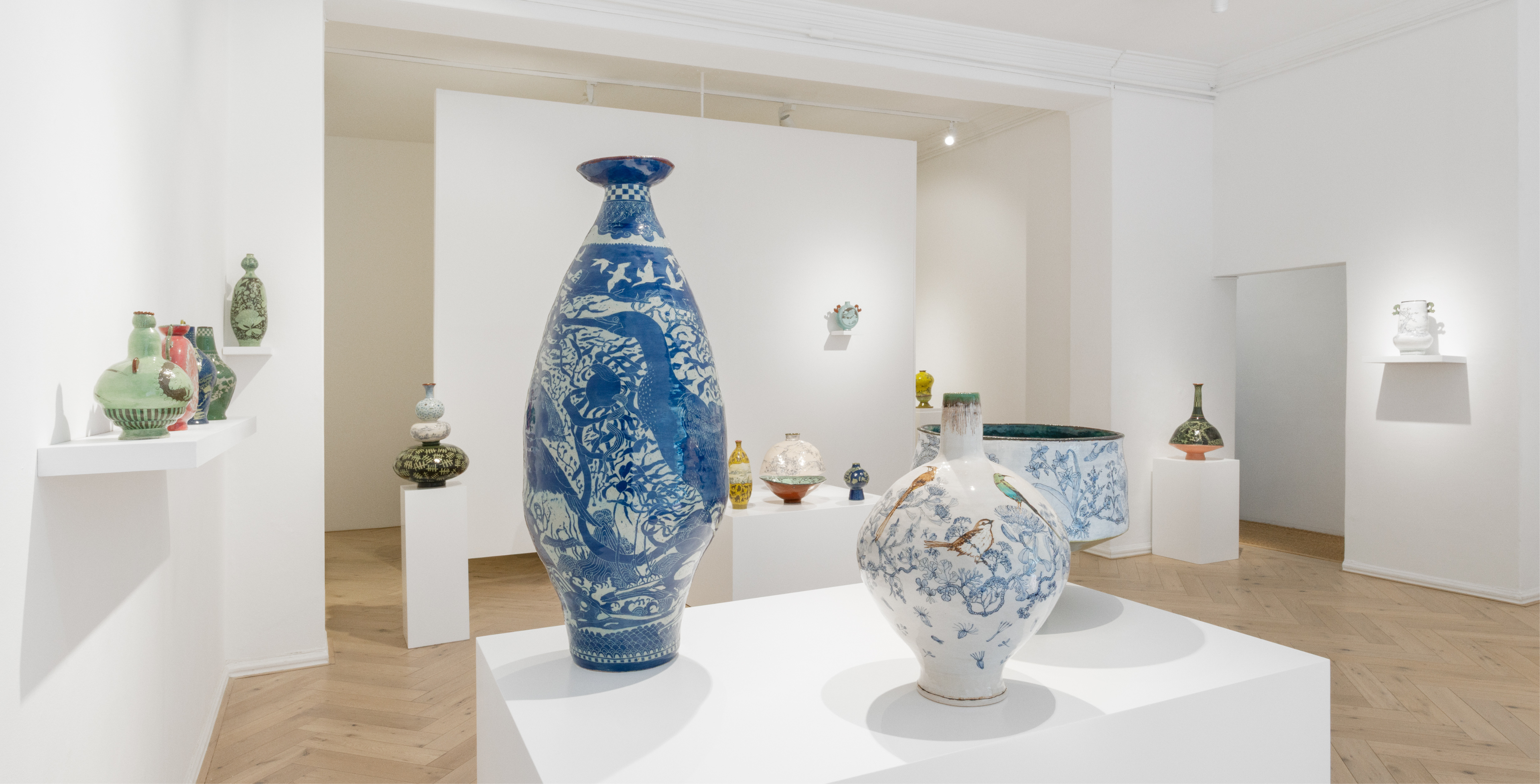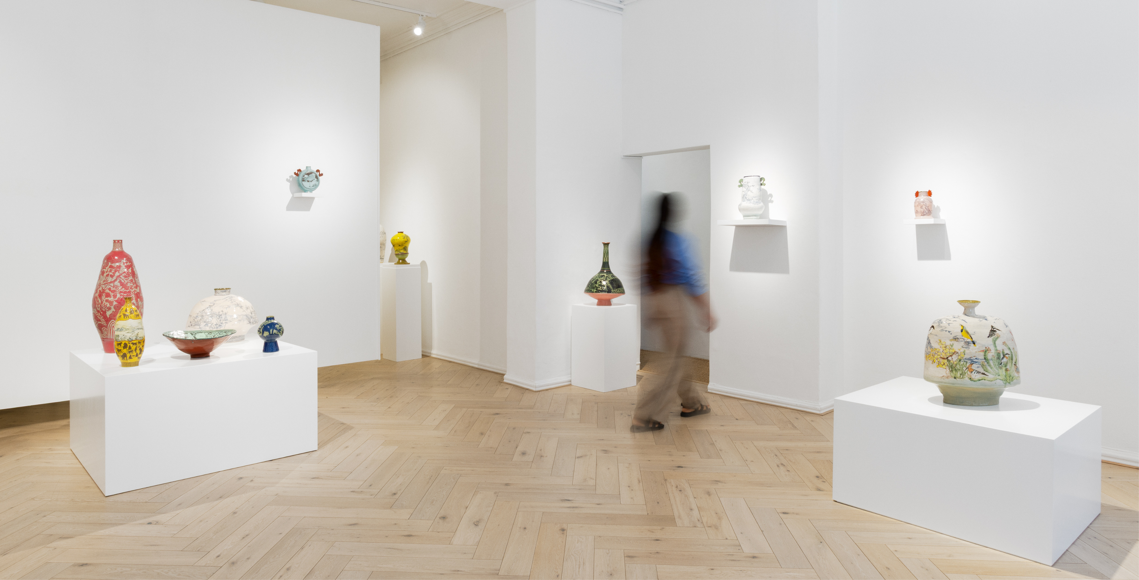 But these vessels do not portray an untouched paradise. Layered over the delicate natural scenes are jarring interruptions: cranes loom, trucks crawl, ‘KEEP OUT’ and ‘DANGER’ signs slice across once-open land. These symbolic invasions tell a story of a landscape under threat, where freedom long synonymous with land and its inhabitants is now fenced off, monitored and mechanised. Clear skylines are disrupted by scaffolding; quiet mountain ranges by the grating presence of uninvited machinery. What was once a sanctuary for life flourishing in its complexity is now subject to extraction and enclosure.