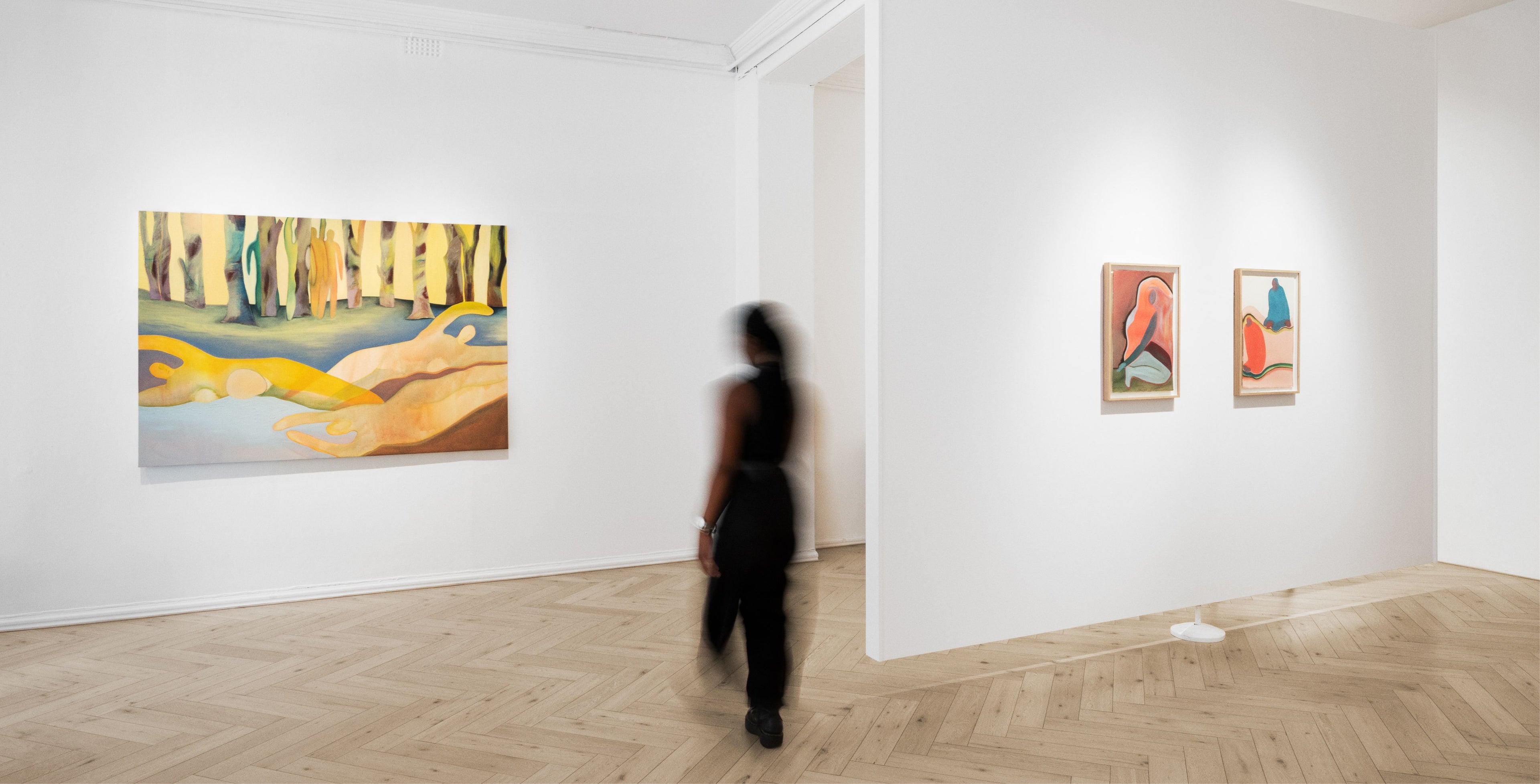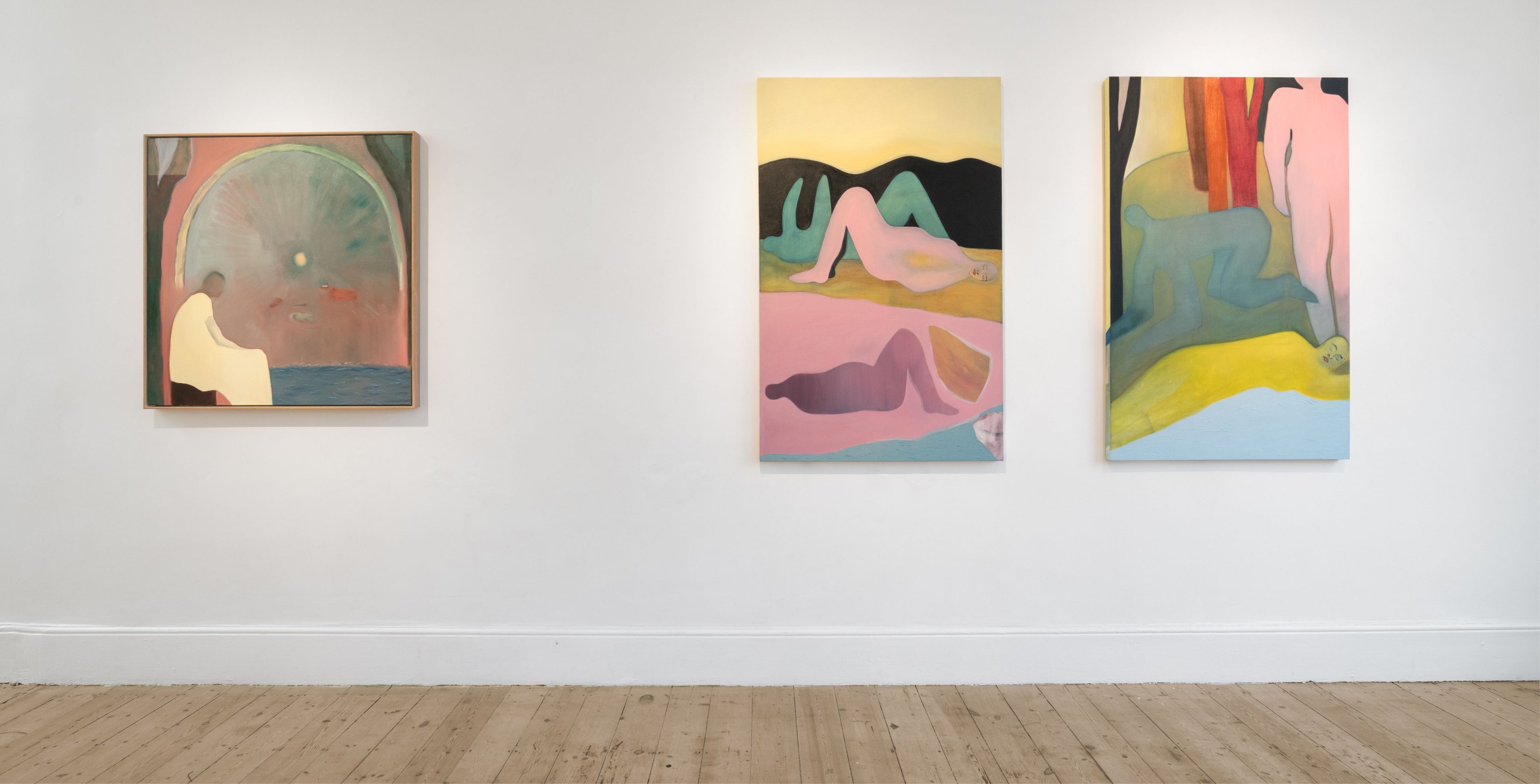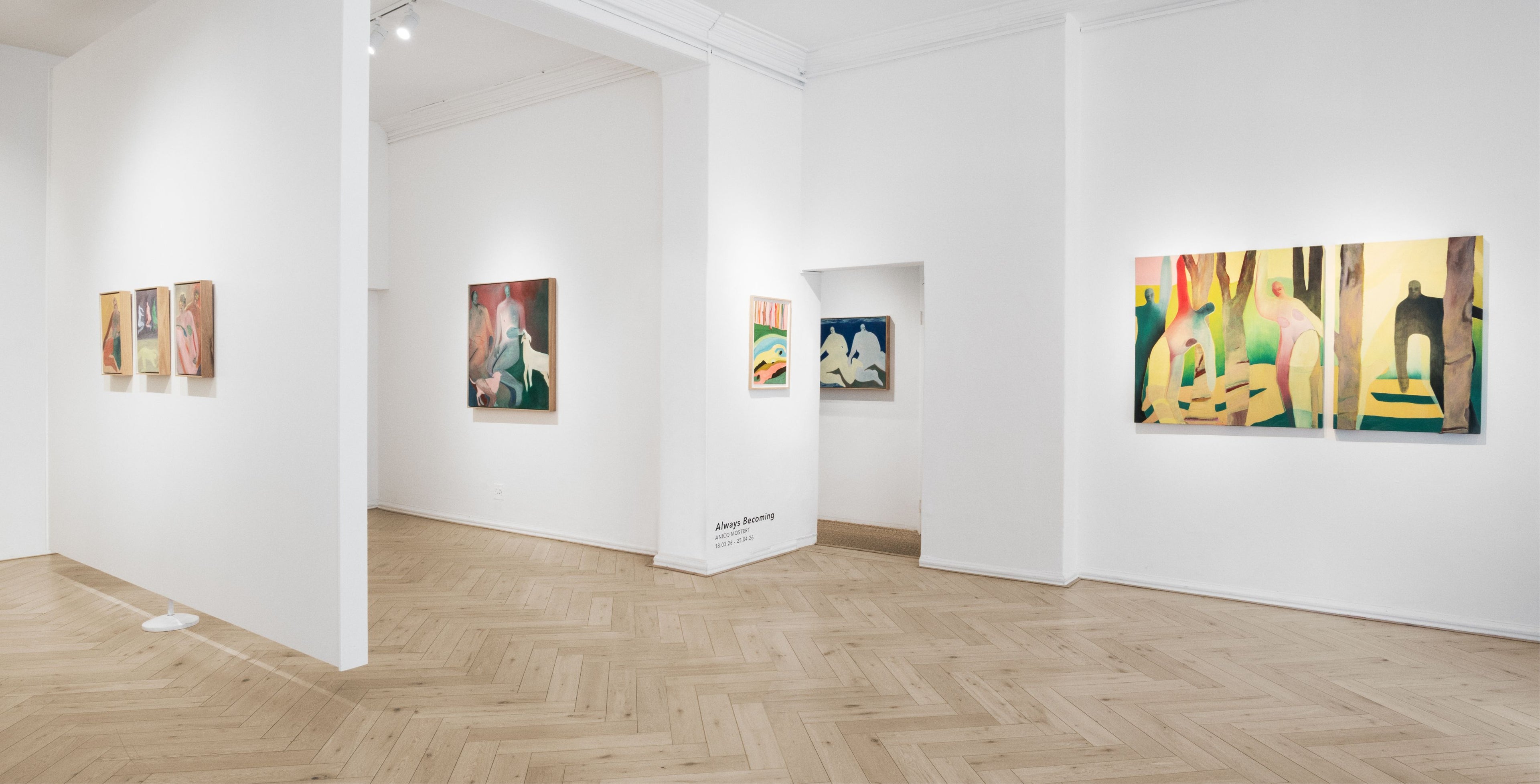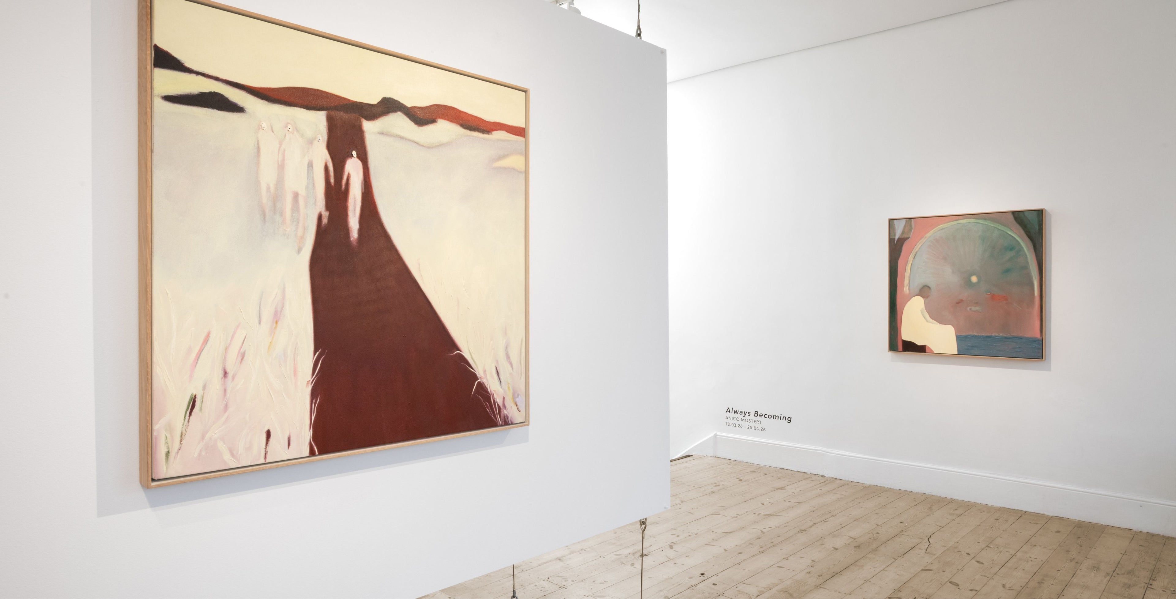 In Anico Mostert’s latest body of work, 'Always Becoming', the artist continues her exploration of interiority and shifting states of consciousness. Known for paintings that merge dreamlike terrain with symbolic forms, Mostert’s practice continues toward a fluid and intuitive visual language. These new works invite audiences deeper into the unconscious, toward unfamiliar territory: a landscape made manifest between the known and the unknown, the self and the othered. Here – in flux – a state of mind is shaped by the artist’s gentle propulsion across the spaces of the imagined and subconscious, one that works to soften the blow of an ongoing, and intense inner evolution.