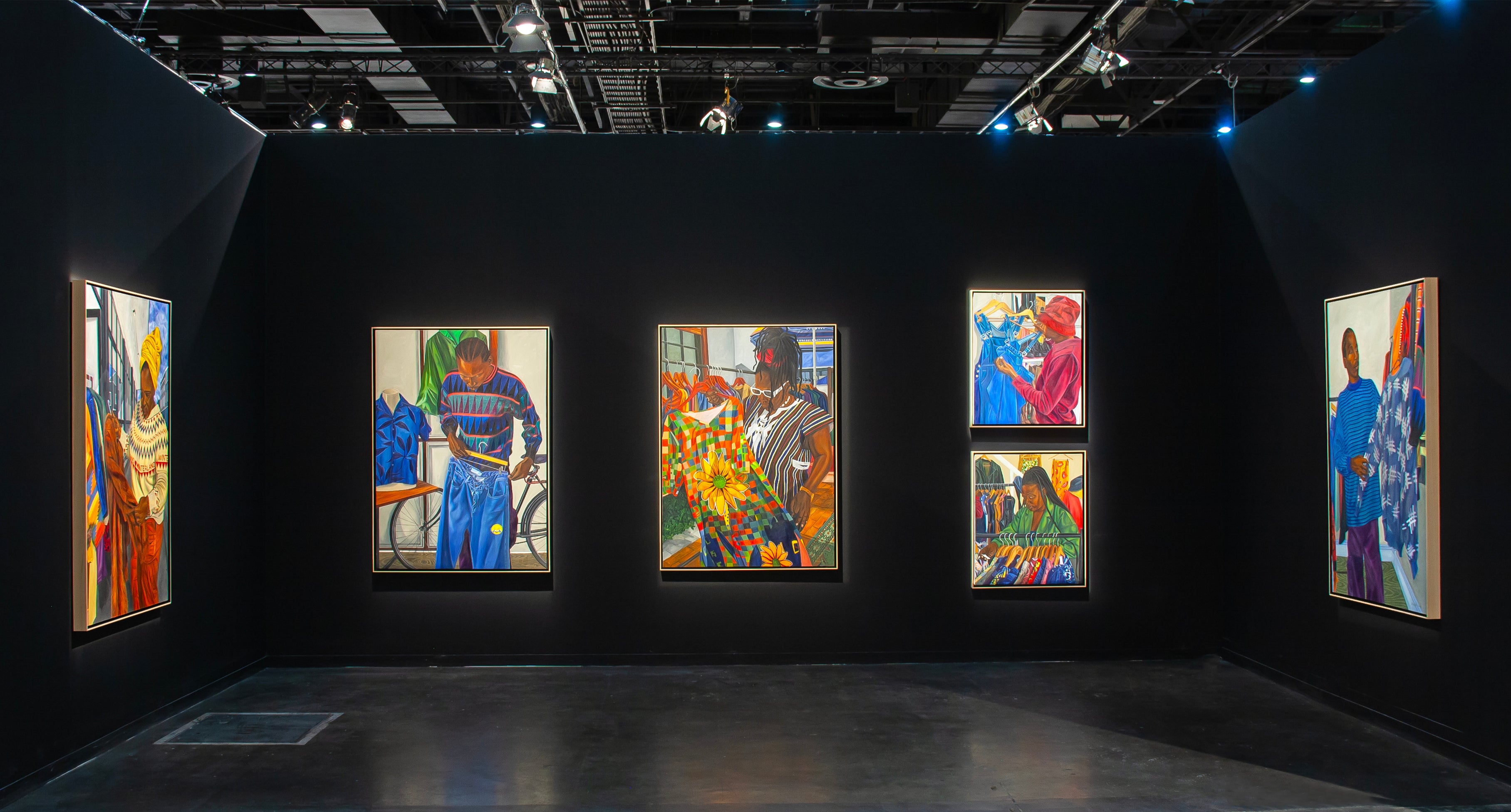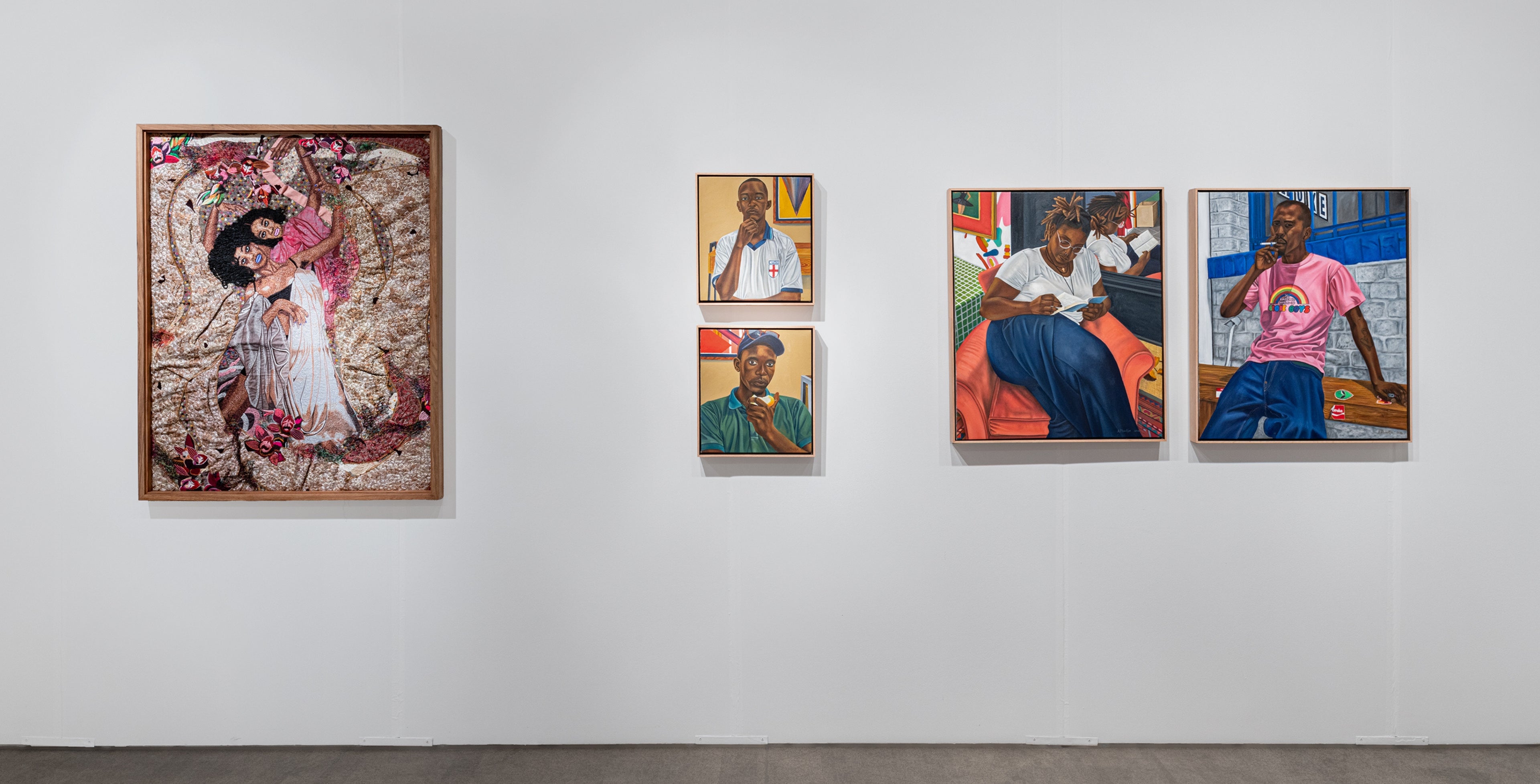 An avid commentator on his community through his identity-based paintings, his characters, friends, neighbours and family are staged onto an often aspirational and imaginary background. Subjects might appear ‘dressed up’ but these often simple garments appear sumptuous in the artist’s expertly malleable hands. His use of colour, texture and luxuriant attention to detail incorporating abstract backgrounds and patterns attend to his ability to weave a strong visual narrative, archiving special moments of the everyday. References to music, film and literature appear frequently, depicting a proud and uninhibited generation with globalised influences.