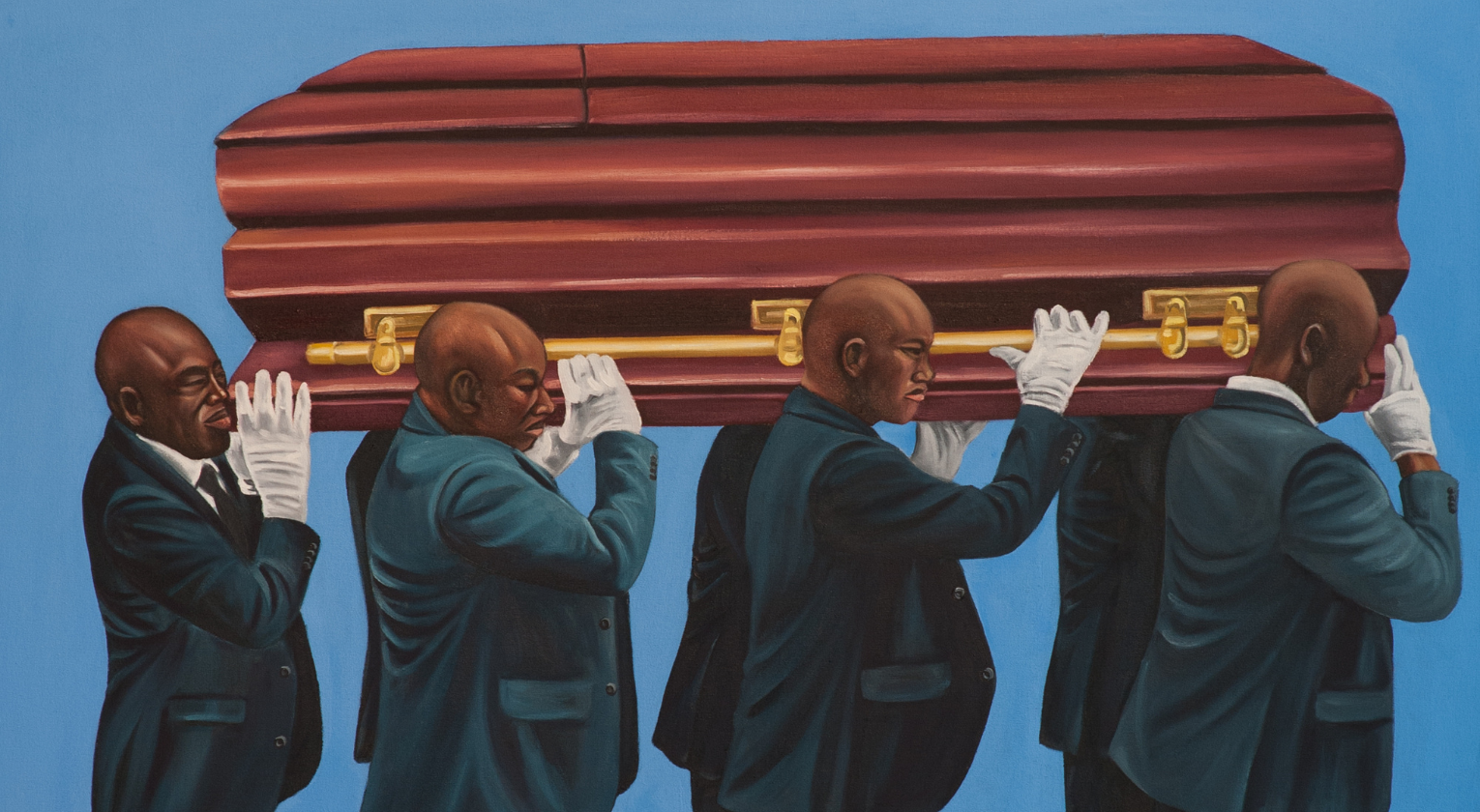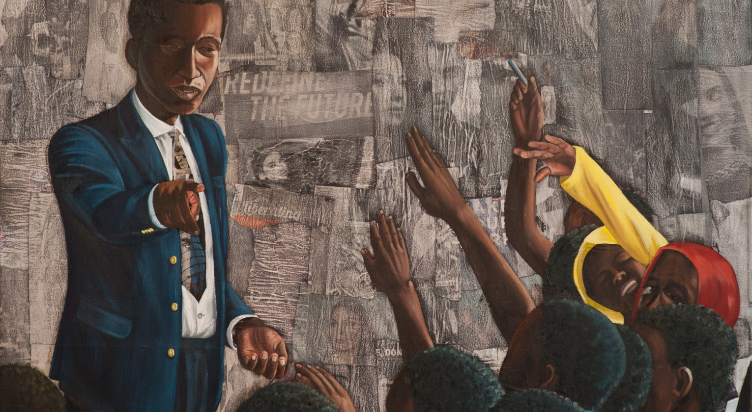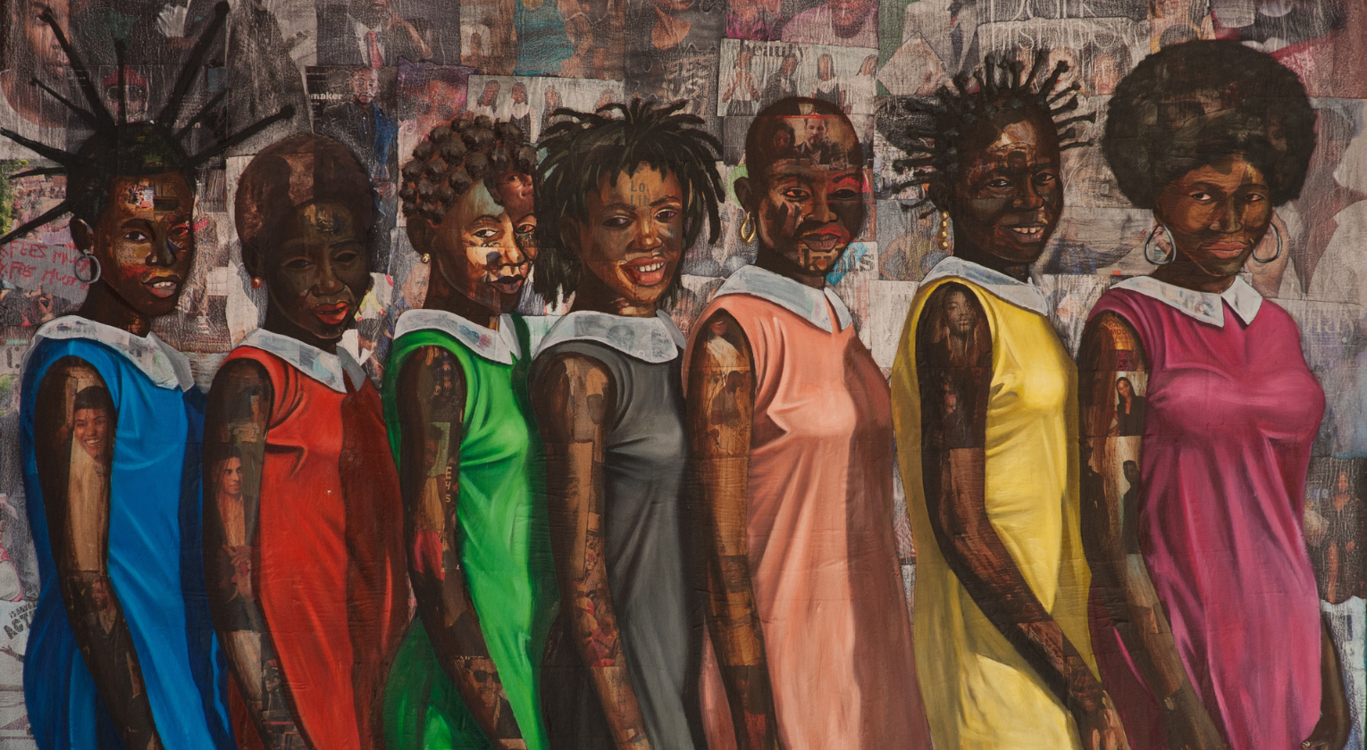 In the top right-hand side of the painting in question, scrawled in red like writing on a wall the iconic hashtag from South Africa’s recent history ‘Fees Must Fall’ can be seen. The Fees Must Fall movement which took the struggle for the reduction in tertiary education costs all the way to Union Buildings in Pretoria, was lead most notably by women. Quivering through the chin of the woman in the pale coral coloured dress the word ‘Kills’ asserts itself like a bruise, a marker of the brutal landscape women are forced to cushion themselves against. The woman on the far right of the group in the blue dress, sings like a contemporary pop culture reference, seemingly styled like a character from Nigerian musician Tiwa Savage’s music video 49-99, a song that beats to the everyday human hustle for agency and self-improvement.