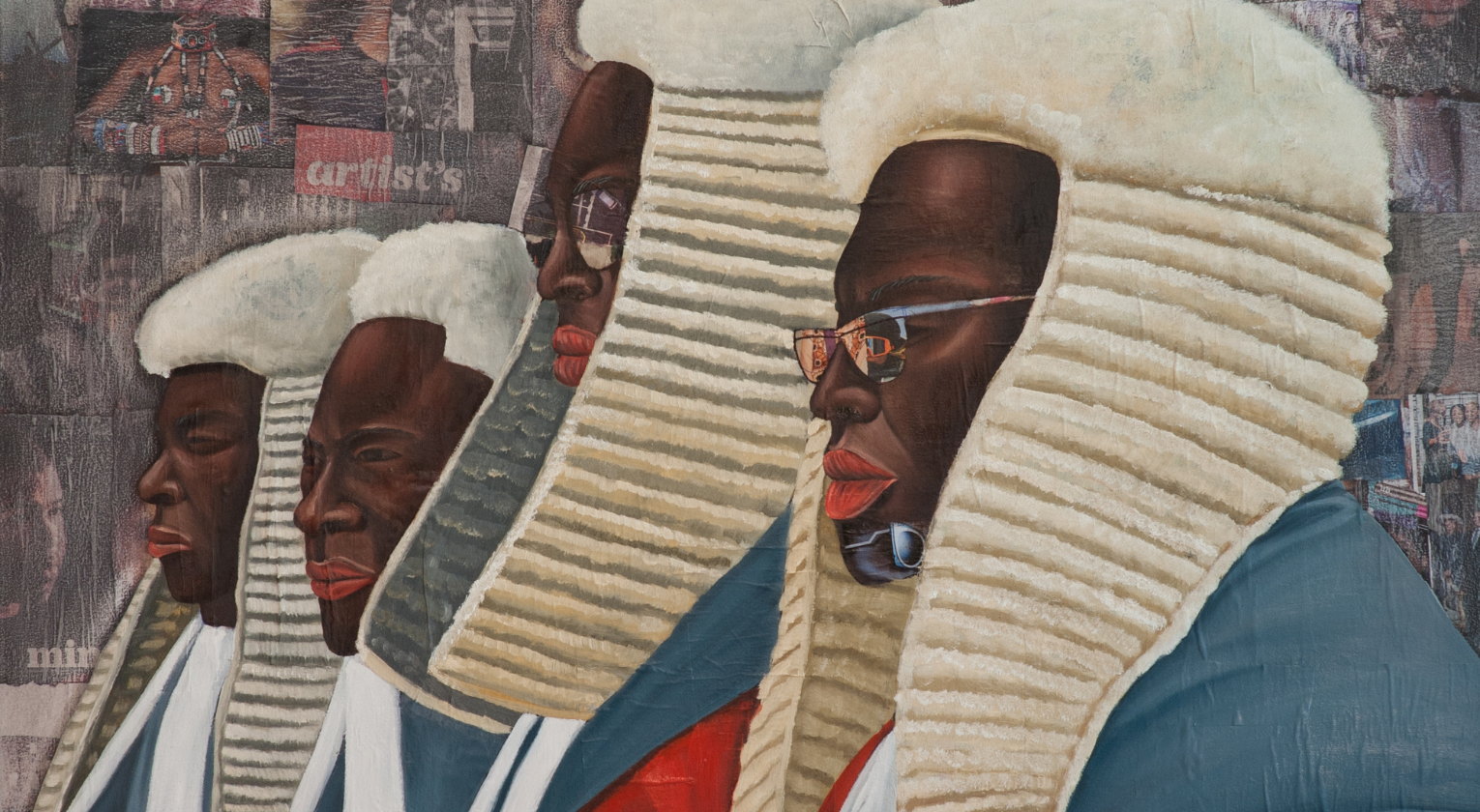 Zemba Luzamba was born 1973 in Lubumbashi, the same year President Mobutu banned the wearing of blazers, shirts and ties in a bid to purge the Congo of as many signifiers of European colonisation as practical, in his drive to assert his system of control over the country’s populace. The men packed away their suits and stepped into the abacost; the women packed away their fashionable miniskirts, covered their hair with head scarves and wrapped themselves from waist to ankle with African wax-print cloth, ironically made in Holland. Freedom of expression was severely constrained. The transition to what was called ‘The Third Republic’ in 1990, came with the freedom to return to more universal forms of dress. Men could wear a suit and tie without fear of arrest but specifically in relation to the reading of the painting Wonders, one notes that some aspects of Mobutu’s enforced dress code were harder to shake. The notion that reputable women wear long skirts is one. A woman wearing a mini remained frowned upon. The mini skirt is an item of clothing that historically references the independence of women, not just in the DRC but globally. To this day a woman’s capacity to feel safe whilst wearing one in public is closely linked to the way women are treated by the society in question.