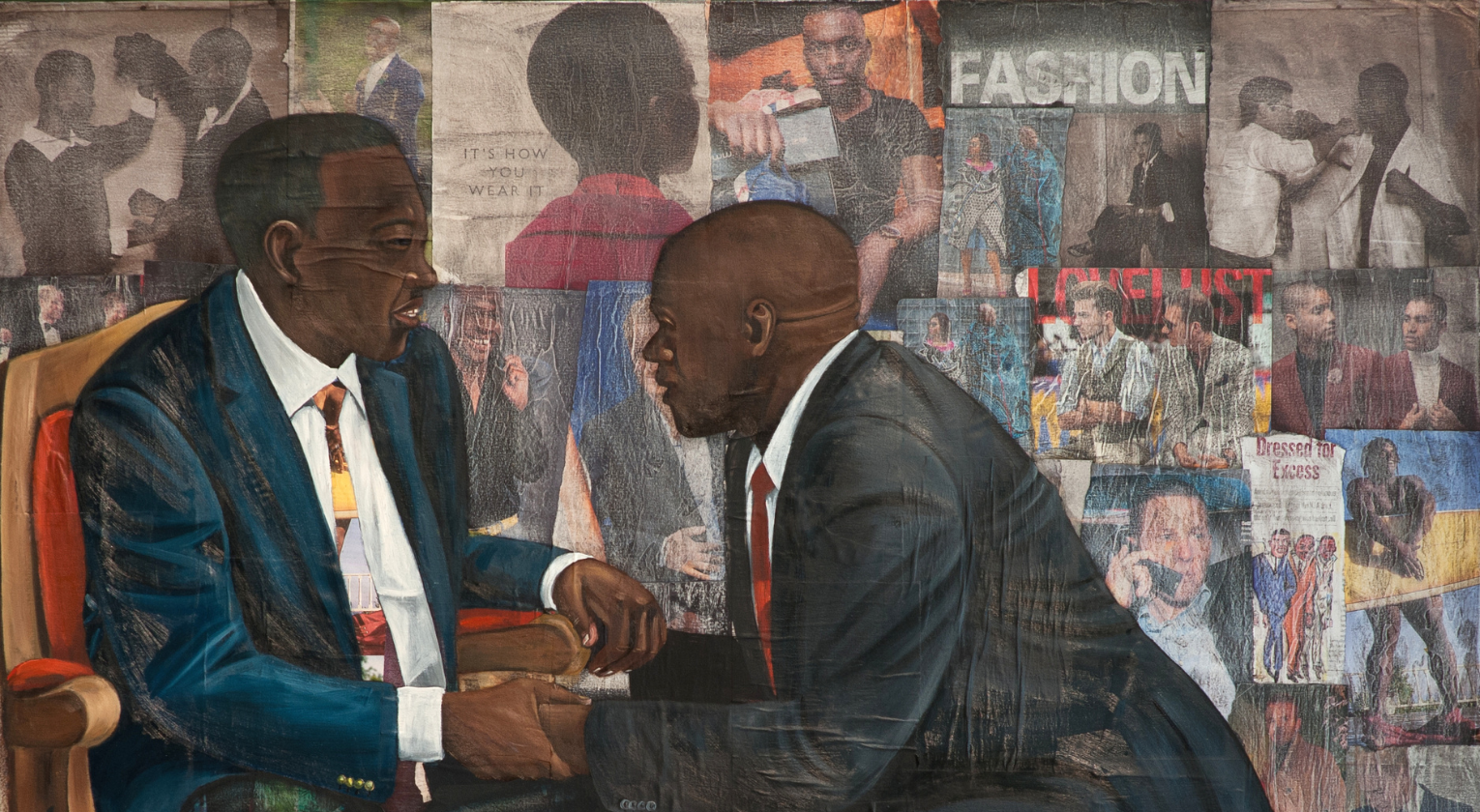 Using the coding inherent in clothing, style and body posture, Luzamba illustrates power dynamics and societal systems. Sometimes the clothing references are specific to the pageantry of power and politics found in Congolese history, and sometimes they relate to status and class exhibitionism found in global life more generally. In earlier works, the people painted are more often than not mere coat hangers, placeholders onto which symbols of clothing are hung, utilised to represent general archetypes in the dance of power. To a degree the same can be seen in this new body of work, though the shift in the materiality of his visual language opens up ambiguous layers for exploration.