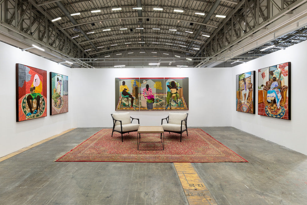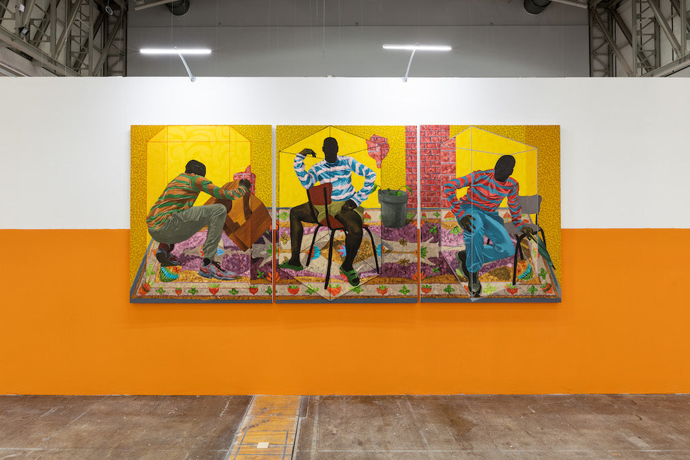 To reproduce and re-story his lived experience, compelling faceless solitary figures are always painted against a background of textiles and notably saturated colours, such as mustard walls from memories of his late grandmother’s home. Chulumanco notes that these figures are self-portraits as well as recreations of his brother and himself at home. Rugs and textile remnants are commonly incorporated in his paintings, which he attributes to the door-to-door salesperson, whom his mother was always easily convinced to buy from because to her love of rugs. Having spent a significant amount of time studying and playing on them, the textures are quite familiar and constant – themes that appear throughout his work.