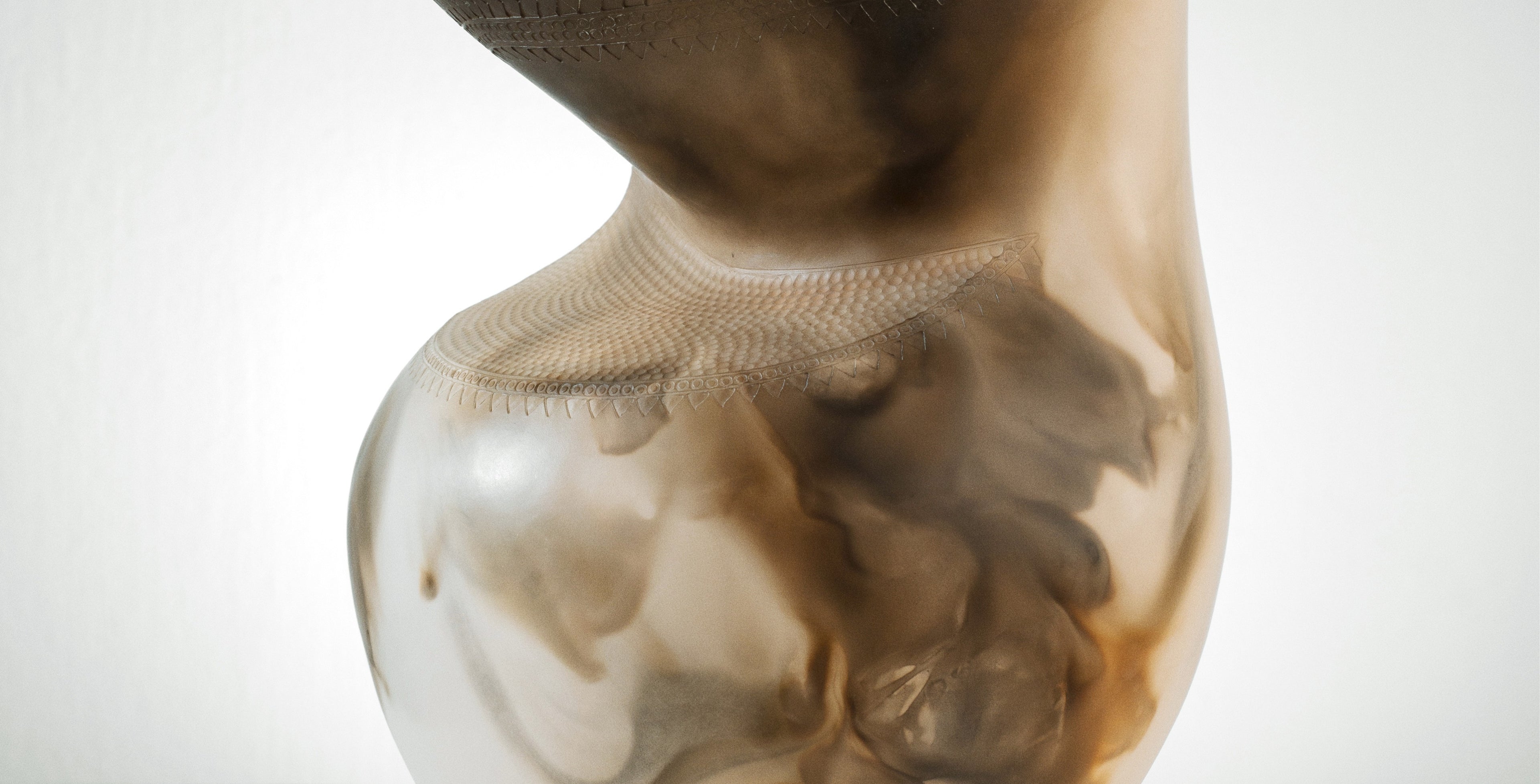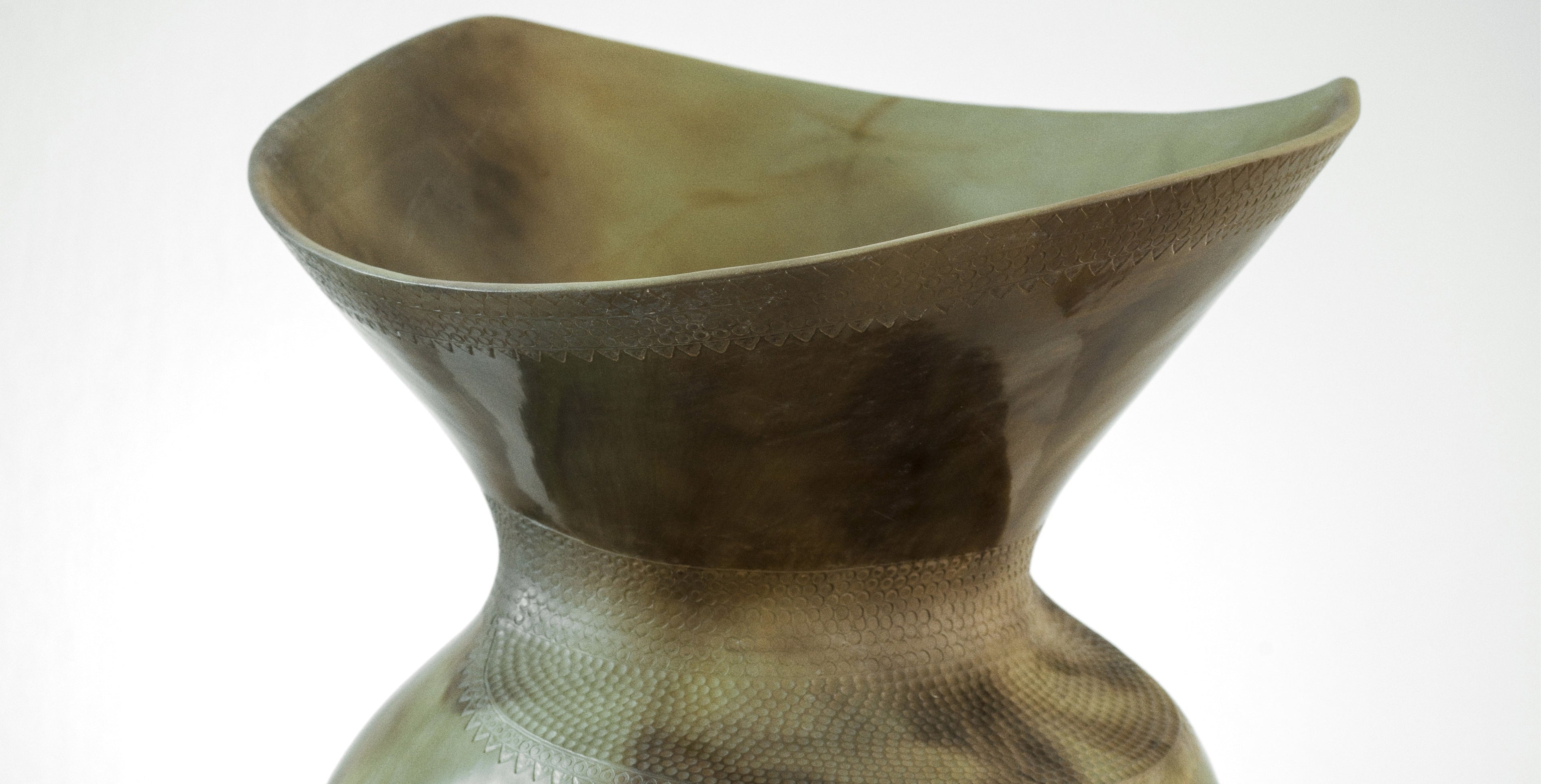 The artist draws on a rich array of influences including African traditional pottery and ancient artefacts that relate to his cultural heritage. Nthunya-Morai’s fascination with the highly decorative and symbolic nature of traditional African craft is evident in the intricate patterns and textures that define his pieces. One such influence is Litema, a Basotho tradition practised by women in Southern Africa to decorate homes after their construction. These flowing patterns, created with fingers, sticks, and other tools, evoke the organic beauty of the natural world—ploughed fields, plant life, and even animals that symbolise clan totems. The restrained use of colour, often limited to two shades, reflects the simplicity and harmony of the African landscape. These influences inform the artist’s use of form, texture, and colour, bringing to life ancestral narratives through abstract visual languages.