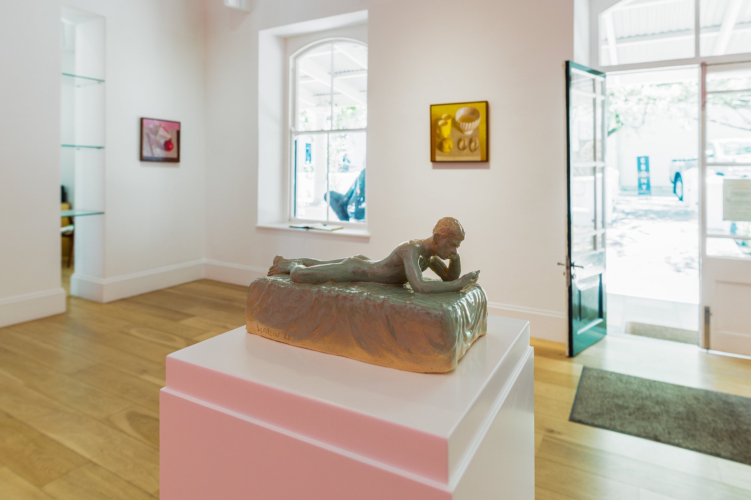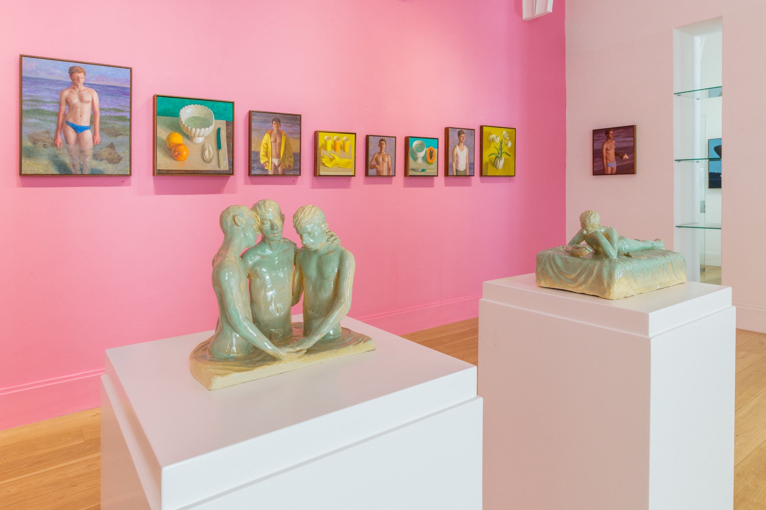 Oliver Scarlin’s “New Works” invites the viewer into a privileged gaze on normally private scenes of domestic intimacy. These vignettes are playfully imagined in a curation of portraits, self-portraits, still-life paintings and ceramic works. While Scarlin’s earlier work distils the story of falling in love, these new works continue to capture the artist’s life with his partner and objects within the home. Here, however, we are also witness to an emergent imagining of queer love beyond a heteronormative couple-form, gesturing at forms of queer collectiveness and falling in love with queerness itself as a mode of being and living. This philosophy of community-building is replicated in the various mediums of the collection – paintings and ceramics and ceramics within paintings – as objects that exist in harmony, as symbolic echoes throughout various works or as actual, tangible objects.