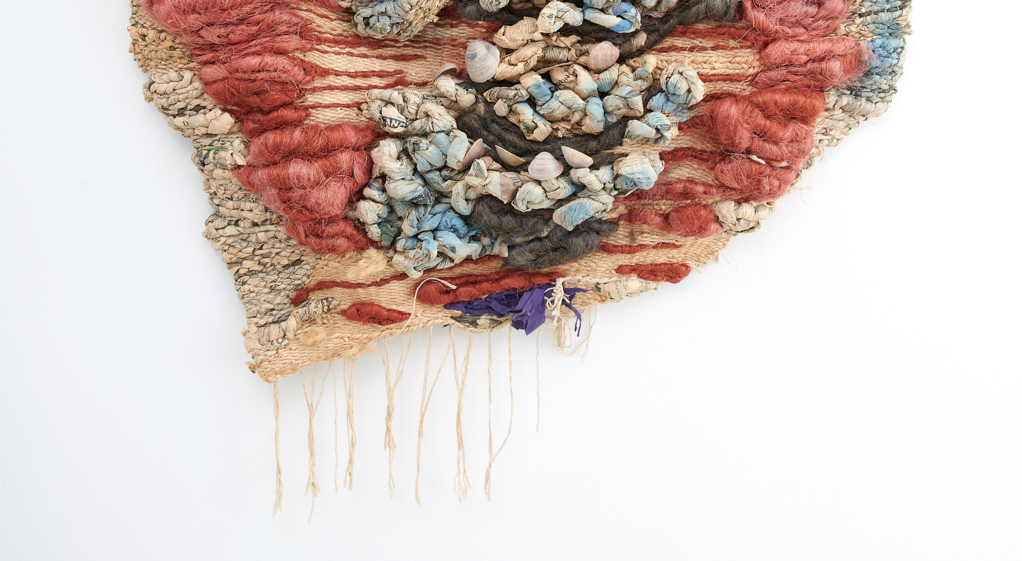 Plácido “Pocho” Guimaraes (b. Malabo, Equatorial Guinea) carries on the tradition of Equatorial Guinean textile craft practice, which has been passed down from generation to generation in local communities and Bubi culture. Using dance, symbols, and experiences to enrich his current works, he contemporizes these traditions, reconnecting with his cultural and family roots. Guimaraes is a disciple of Josep Grau-Garriga and uses the high heddle technique rather than traditional looms. The unusual materials he incorporates into his work are fabrics of African origin; old newspapers and waste materials, as well as objects found in the cities and natural environments around Malabo and Madrid. These found residual elements carry personal or family meanings, with each of the works he produces referring to a specific theme and reality of his immediate environment: his political dissent, family customs, and rituals. Touch and the tactile nature of his work are highly important elements to help narrate the personal stories of Bubi culture, so relevant to his history.